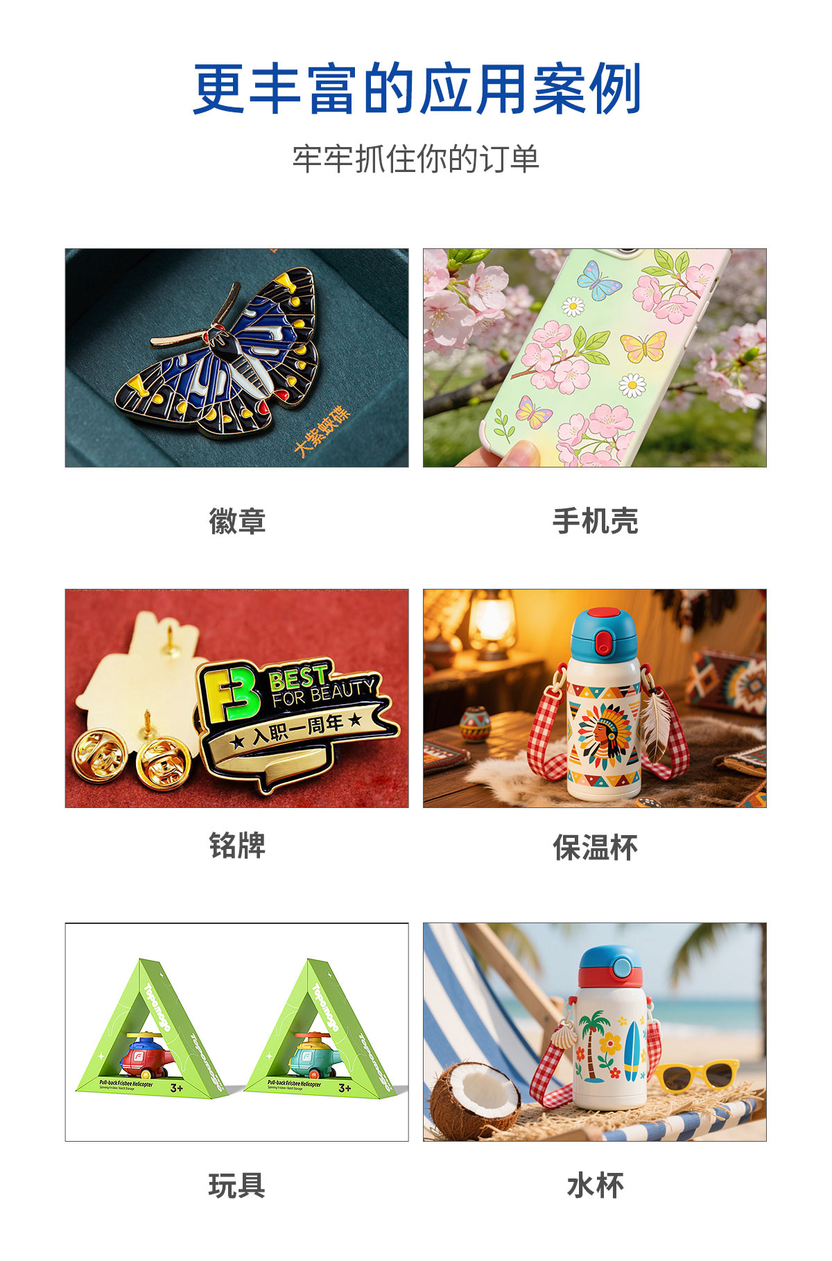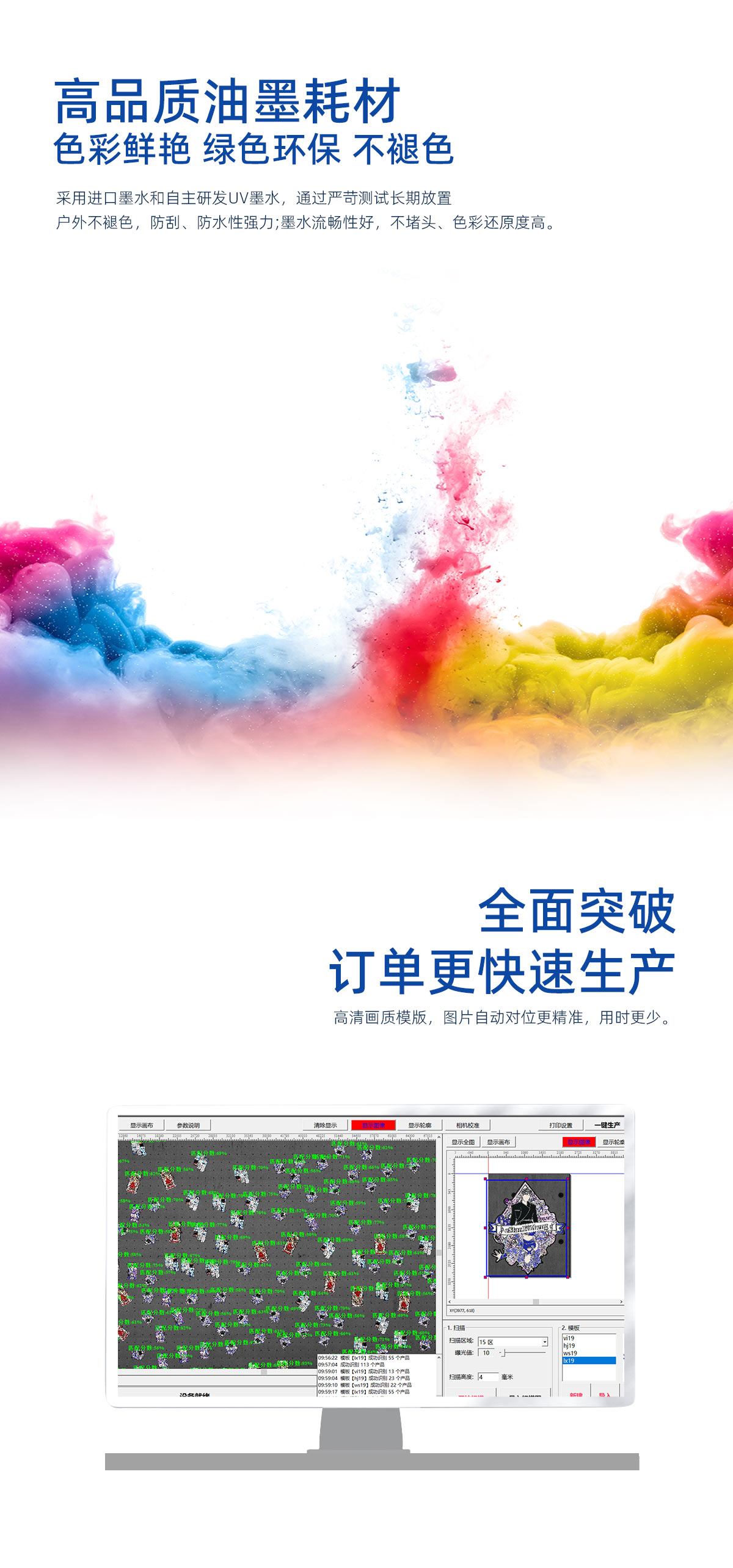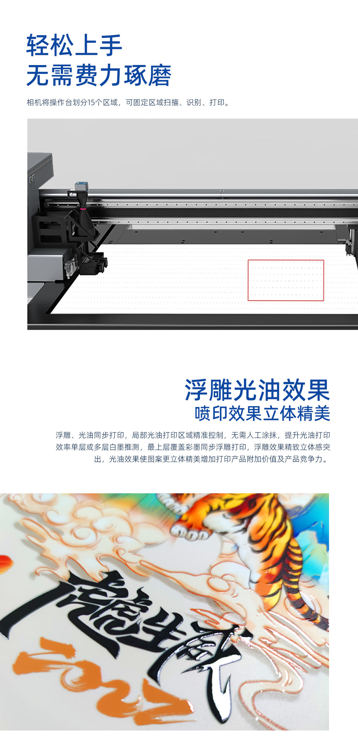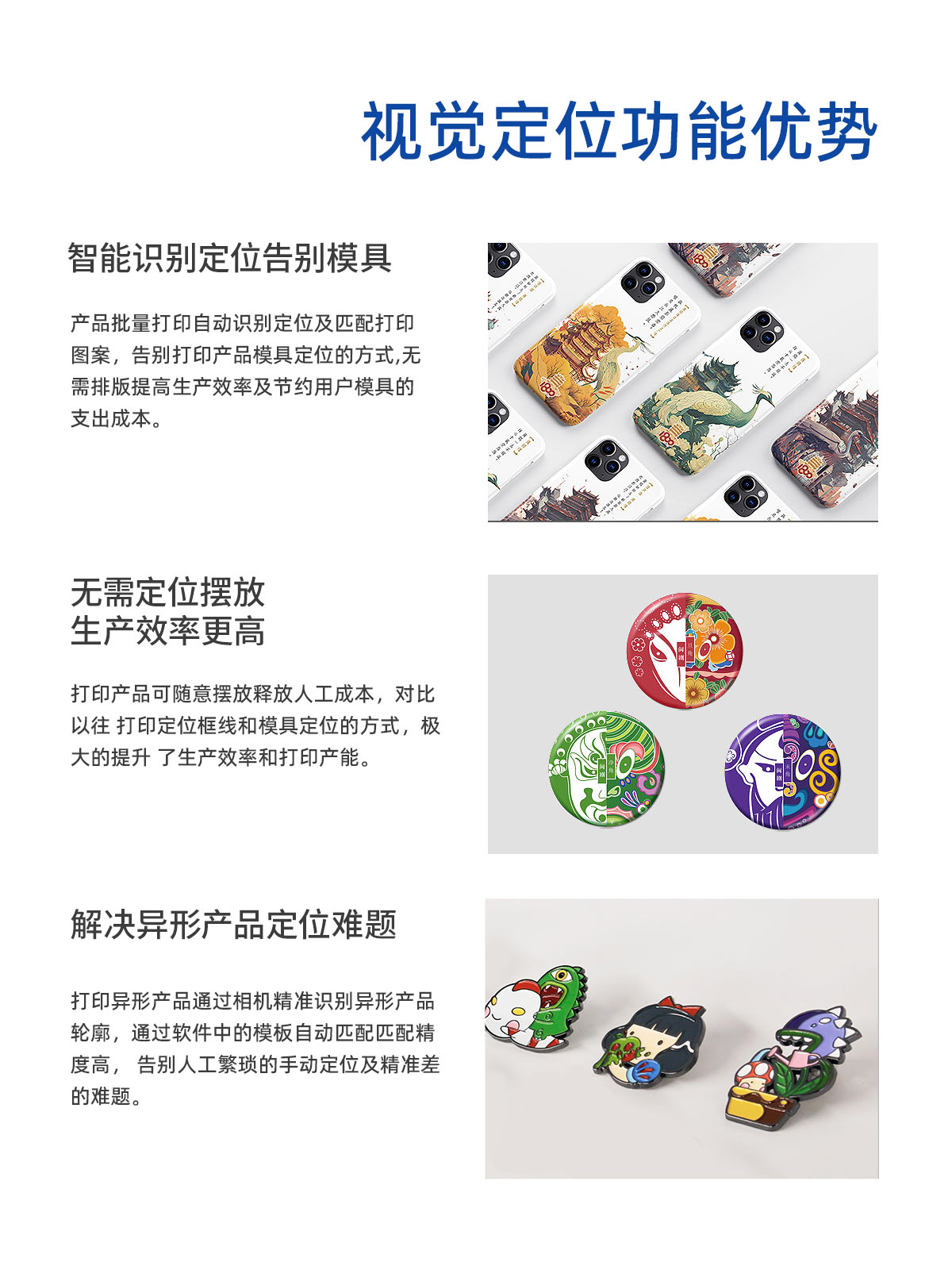 产品描述:鼎力数码视觉定位uv打印机不需要打印产品定位框,各种异形材料随意摆放到平台自动识别可以精准打印产品。