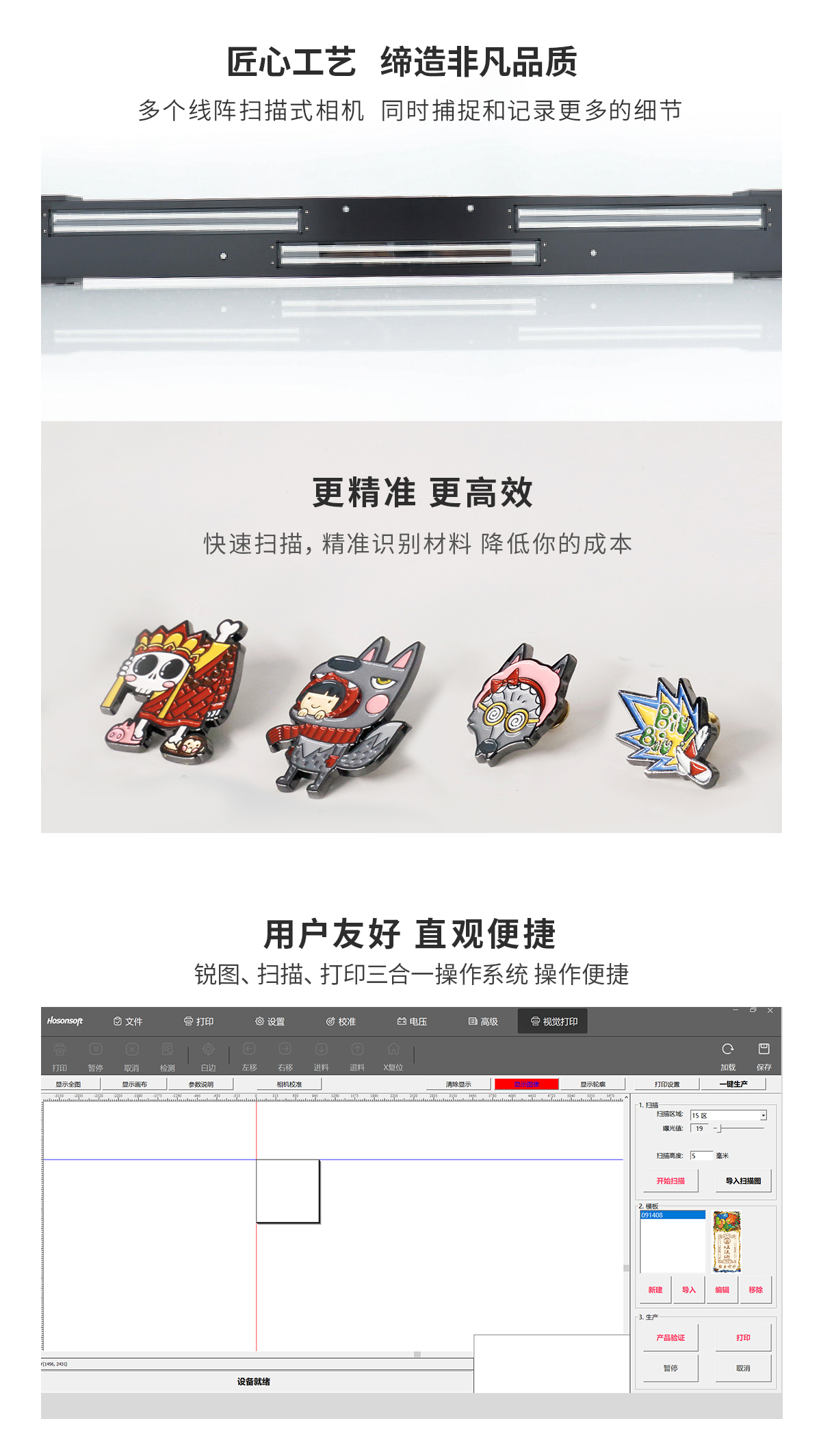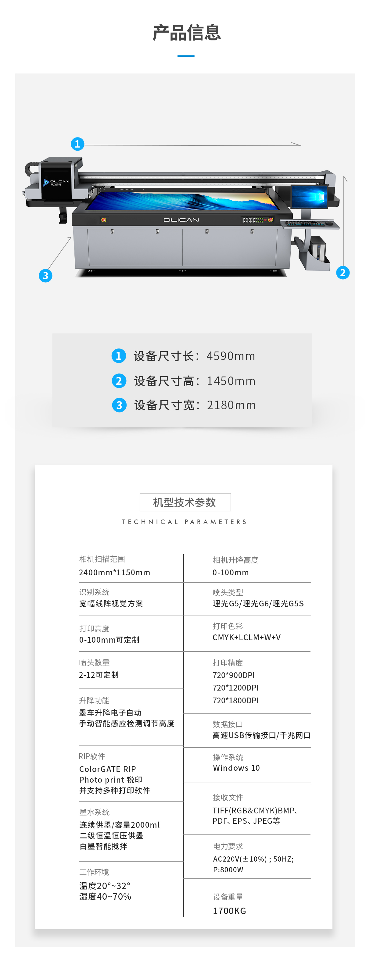 产品描述:最大打印尺寸2.5m*1.3m,UV打印机黄金尺寸,非接触uv喷墨打印,即打即干,无需制版,灵活应对多种打印应用,长周期规模化打印稳定可靠。