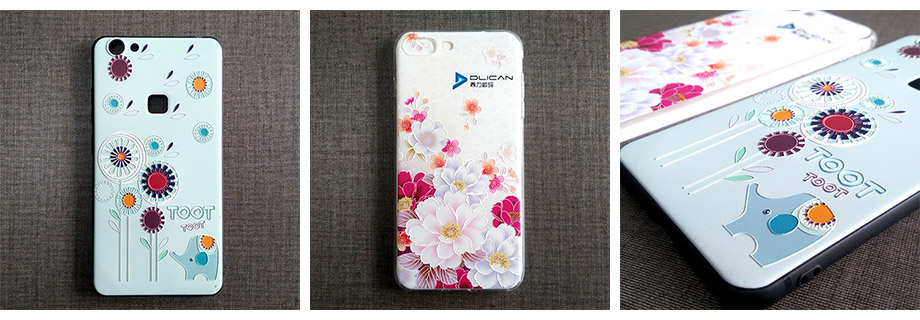 鼎力手机壳打印机可用于手机壳软壳、硬壳、TPU手机壳、皮套、硅胶壳的表面打印,可加工成浮雕和光油效果。