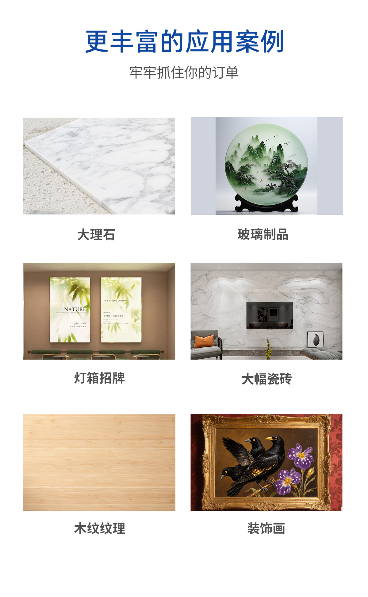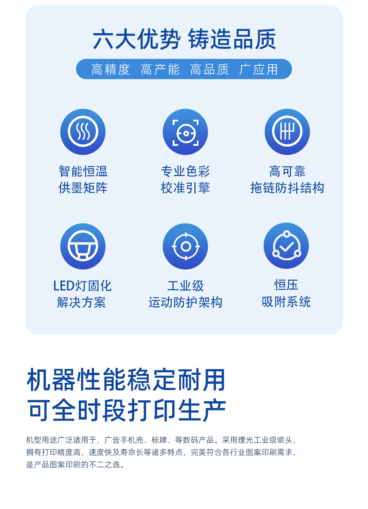 产品描述:打印尺寸1m*1m,小巧机身灵活应对多种打印需求,稳定高效,白彩光油同步打印,高分辨率彩印效果,打印图像效果细腻清晰。